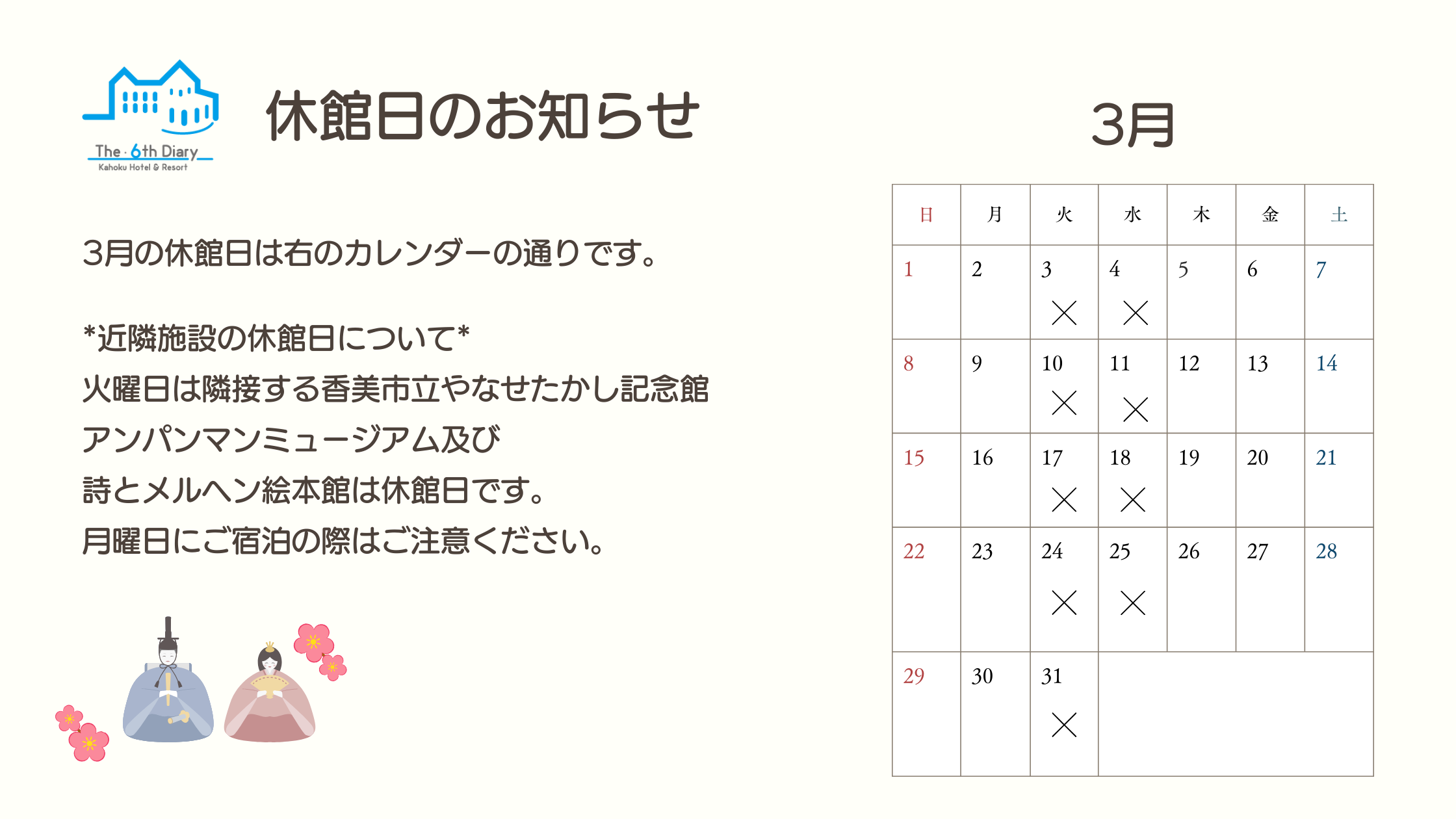 【お知らせ】2026年2月〜3月の休館日について
