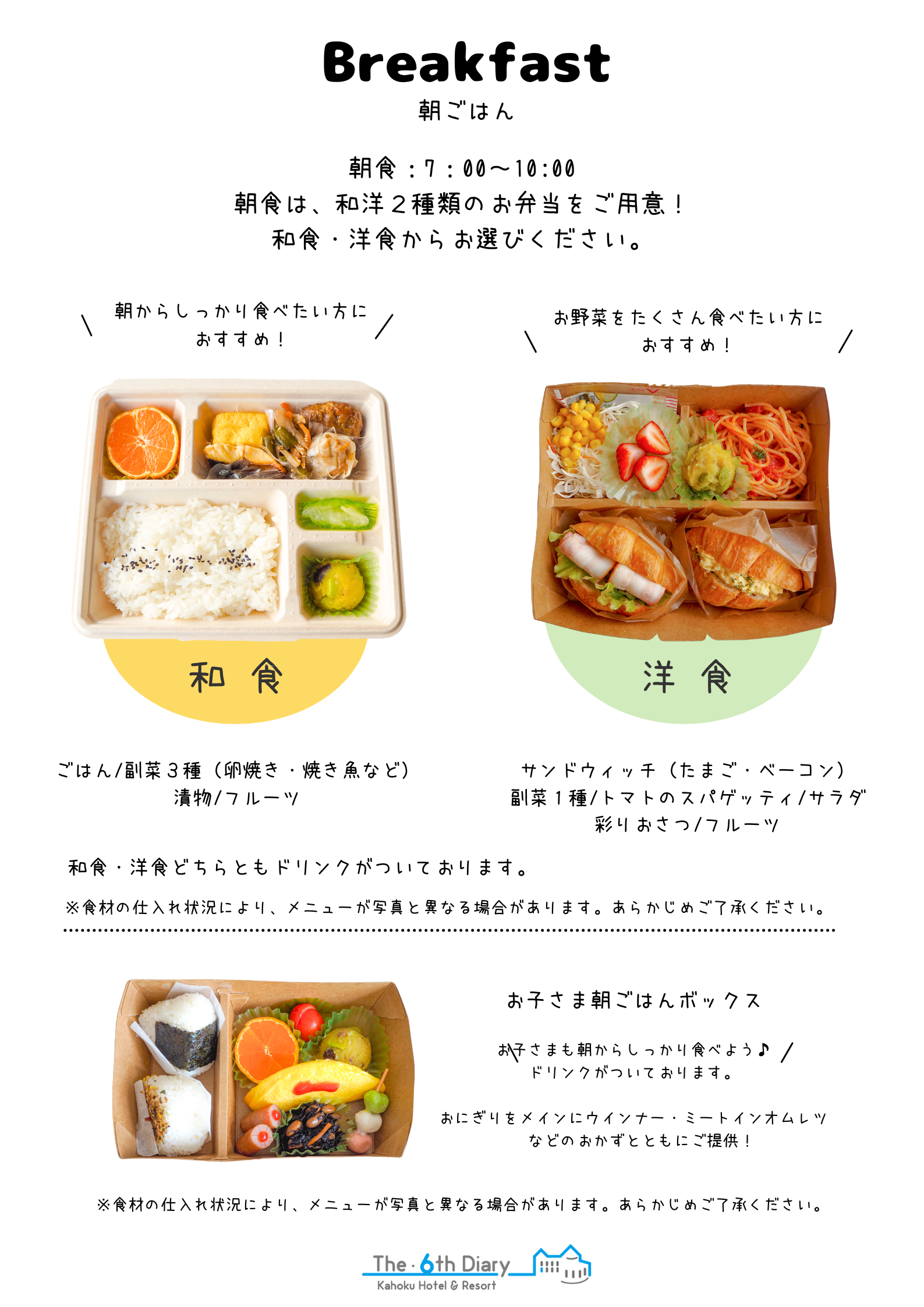 朝食のみ、お部屋でもお召し上がりいただけるお弁当スタイルでご提供しております。